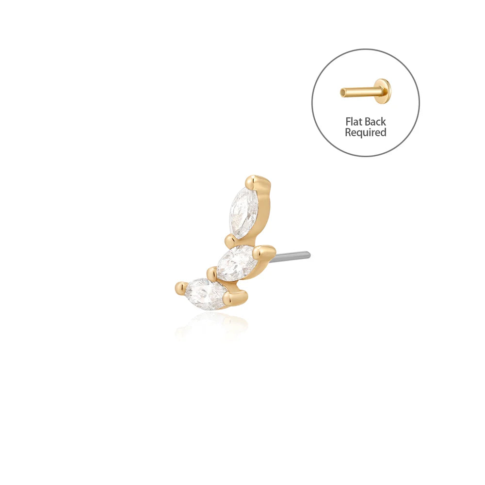 The Briar threadless top earring showcases a stunning arrangement of three marquise-cut lab-grown diamonds, exuding a sophisticated and elegant design. This threadless top adds a refined, symmetrical touch to your piercing, offering a blend of luxury and sustainability. Flatback post required and sold separately to be determined based on piercing location.